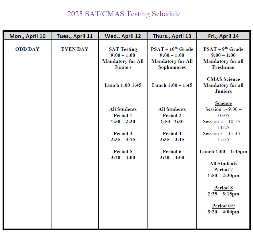 SAT/CMAS Schedule for the week of April 10-14 2023