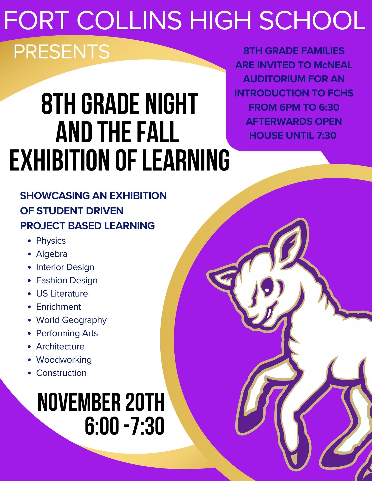 8th grade families are invited to McNeal Auditorium at 6:00 PM for an introduction to programs offered at Fort Collins High School.